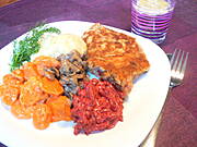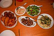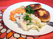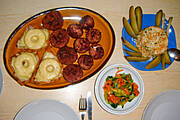 Kotlety drobiowe zapiekane z ananasem i żółtym serem, kotlety mielone, pulpety faszerowane serem feta, gotowane ziemniaki, surówka, ogórki kiszone, duszone na maśle marchewka z cukinią, sos koperkowy.