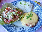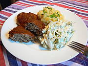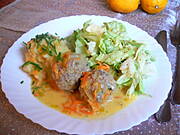 Roladki schabowe z szynką surową i żóltym serem, puree ziemniaczane, sałata z czerwoną pomarańczą.