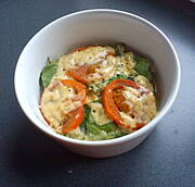 Piersi z kurczaka zapiekane pod szpinakiem z pomidorami i serem.