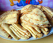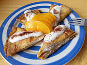 Wczorajsza zupa fasolowa, naleśniki z serem, śmietaną i cynamonem, wcześniej przysmażone na maśle, dla dzieci dodatkowo z brzoskwiniami z puszki.