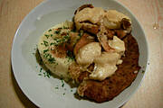 U nas kasza gryczana / ziemniaki z sosem pieczarkowym plus ogórek korniszony.