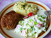 Czwartek: ziemniaki, smażona biała kiełbasa z cebulą, sałatki ,,słoikowe" zapasy z piwnicy