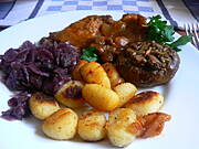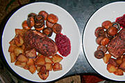 Filety z kurczaka w sosie pieczeniowym, pieczone ziemniaki z suszonymi pomidorami i serem pleśniowym, kiszone ogórki, sałatka warzywna w zalewie octowej, smażone pieczarki.