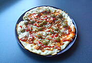 Pizza z patelni z pomidorami, serem pleśniowym i oliwkami.