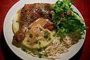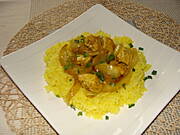 Filet drobiowy z dymką , marynowany na nutę orientalną i ryż z masłem i kurkumą.