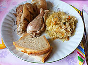 Dzisiaj obiad na życzenie męża:) Golonka gotowana w ziołach, kapusta kiszona gotowana z jabłkami, majerankiem i kminkiem, pieczywo.