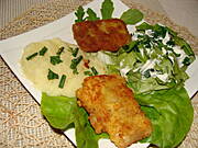 Paluchy z fileta kurczaka panierowane,sos czosnkowy,frytki,mizeria.