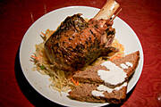 Duszona łopatka we własnym sosie, makaron i sałata lodowa z sosem czosnkowym i szczypiorkiem.
