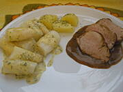 Megi polędwicę popełniłam na niedzielę, poleżała w marynacie 24 g potem opiekłam ze wszystkich stron, włożyłam do gęsiarki, podlałam wodą (bo przyprawy były w marynacie), dodałam cebulę w ćwiartki, 2 ząbki czosnku i dusiłam pod przykryciem godzinę..... sos lekko zagęściłam i .... np i tyle... powiem tak...SZAŁU NI MA ... ale mięsko wyszło mięciutkie więc panowie pochłonęli je na 2 obiady.