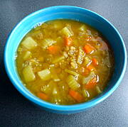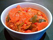 Leczo warzywne (mój a'la gulasz ciut zmodyfikowany, bo bez fasolki szparagowej), rosół z makaronem dla córy.