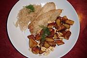 Zapiekanka z ziemniaków, cebuli, piersi kurzęcej z oregano i peperoncino, pomidory z oliwą, octem i bazylią.