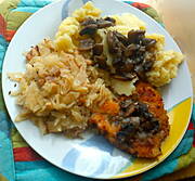 Kotlety z piersi kurczaka, ziemniaki tłuczone, sos pieczarkowy i kapusta zasmażana.