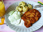 Ziemniaki z koperkiem, schaboszczak i mizeria, do picia sok pomarańczowy i herbata z cytryną.