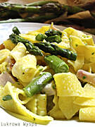 Makaron ze szparagami, cukinią, szynką gotowaną.