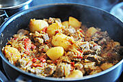 Bigosik z młodej kapustki,brazylijskie mielone,ziemniaki i mizeria.