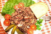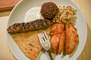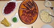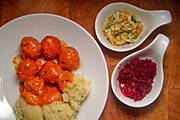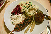 Mielone z szynki na trzy sposoby - grillowane paluchy, pulpety z pieczarką w środku i tradycyjne kotlety mielone, puree ziemniaczane ze szczypiorkiem, zasmażane buraczki, kiszone ogórki, surówka.