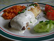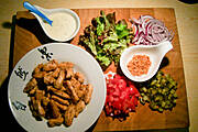 Tortilla z kurczakiem, czerwoną cebulą, pomidorem, konserwowymi ogórkami, sałatą (nie wiem co to - sprawdzę), sosem czosnkowym i prażoną cebulką.