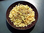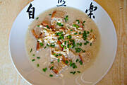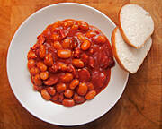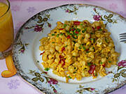 Zupa fasolowa ze skwareczkami z boczku wędzonego, makaron z chili, szczypiorkiem i jajkami, smażony na maśle. Do picia sok pomarańczowy i herbata z cytryną.
