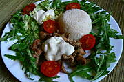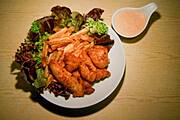 Reszta nuggetsów z kurczaka, frytki, trzy rodzaje sałat, dip śmietanowo-majonezowy z dodatkiem sosu Sambal Oelek.
