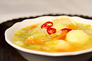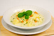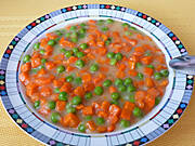 Zupa marchewkowa, brązowy ryż z warzywami i zieloną soczewicą.