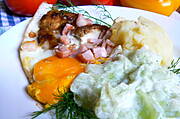 Zupa pomidorowa z makaronem,jajko sadzone na kotlecie drobiowym ,posypane boczkiem,ziemniaki i mizeria ....