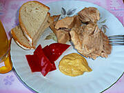 Pomidorowa z ryżem lub makaronem, gotowana biodrówka wieprzowa z zupy, musztarda i chleb na zakwasie.Do picia schłodzona herbata z cytryna i sok pomarańczowy.