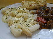 Absolutnie '' merytorycznie '' nie pasujące do siebie elementy obiadu , okazały się świetnym tercetem obiadowym : gulasz z karkówki , knedel i szparagi w sosie maślano - cytrynowym .. ))