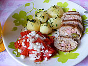 Pierś drobiowa faszerowana ananasem i serkiem topionym, ziemniaki z koperkiem i sałatka pomidorowa z sosem ziołoym i chili.Do picia kompot rabarbarowy i sok jabłkowy.