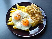 Wczorajszy rosoł z makaronem, na drugie gyros z kurczaka, jajko sadzone, ziemniaki i salata lodowa w sosie koperkowo - szczypiorkowym, do picia sok z jablek.