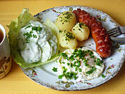 Szybki obiad, ziemniaki z koperkiem, jajko sadzone ze szczypiorkiem, najeżona smażona kiełbasa i mizeria. Do picia herbata z cytryną i woda z sokiem malinowym.