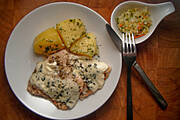 Darowane filety z morszczuka, czosnkowo-maślano-koperkowe i pyszna sałatka z jajka, groszku i szczypioru wg bonieś.