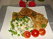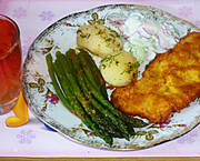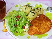 U nas na obiad, kotlet w jajeczno śmietanowej koszulce z naszego przepisu, ziemniaki z koperkiem i sałata z sosem ziołowym i papryczką chili.Do picia herbata schłodzona z cytryną i woda z sokiem wiśniowym.
