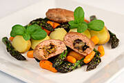 Kotlety mielone nadziewane porami i suszonymi pomidorami podane z młodymi ziemniakami z bliżej nieokreślonego zakątka nie naszego świata oraz łebkami zielonych szparagów duszonych na maśle z małymi marchewkami :)