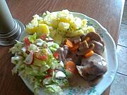 Wczorajsza zupa pomidorowa z makaronem, na drugie piersi kurczaka w przyprawach z piekarnika, pieczarki duszone w sosie sojowym, ziemniaki i salata lodowa w smietanie.
