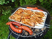 Na obiad więc była młoda kapustka, po skrzydełku z pieczarkami i ziemniaki, Później był grill, karkówka i kiełbasa, do picia herbata z cytryną, coca cola i sok pomarańczowy.