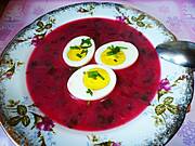 Barszcz czerwony czysty z uszkami z mięsem, dla chętnych skrzydełka z piekarnika ze świeżą bułką. Kompot rabarbarowo- jabłkowy.