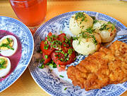 Wczorajsza botwinka z jajkiem, ziemniaki z koperkiem, kotlet schabowy i sałatka z pomidorów ze szczypiorkiem. Do picia kompot z rabarbaru i woda mineralna z cytryną.