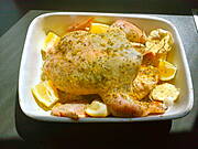 Fajny smak daje mieszanka rozmarynu, tymianku i drobno startej skórki cytrynowej, pieprzu i soli - tym nacieramy kurczaka między skórą a mięsem (trzeba delikatnie wyluzować skórę). Tym też natarłam kurczaka z zewnątrz. Do środka zaś cytryna pokrojona w ćwiartki. A oprócz tego obkładamy kurczaka cytryną plus główka czosnku przekrojona na pół w poprzek (tak jak widać na zdjęciu). Piekłam go w 180C jakieś półtorej godzinki. Naprawdę smaczny i bardzo soczysty.