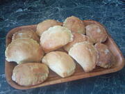 Pieczone pierogi na podstawie przepisu Mamy-Różyczki. Połowa z nadzieniem bialego serka z rodzynkami, pozostale z nutellą. Wszystkie dobrze posklejane, nic nie wyplynęło. Z przepisu wyszło 26, wcale niemałych pierogów.