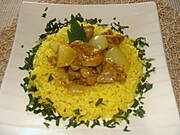 Kurczak curry z kolendrą, cebulką i ryżem.