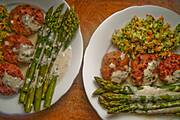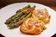 Paczuszki z ciasta francuskiego z mięsem mielonym, zielone szparagi z zasmażoną na maśle bułką tartą.