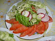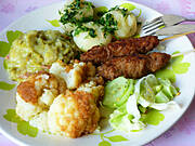 Ziemniaki z koperkiem, gotowany kalafior z masłem i przesmażona bułką tartą, młoda kapusta i Ćevapčići wg przepisu izeczka, surówka z ogórka i sałaty lodowej z octem winnym. Do picia kompot z rabarbaru i coca cola.