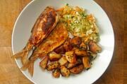 Własnoręcznie złowione, smażone tusze płoci, smażone ziemniaki z natką pietruszki, surówka.