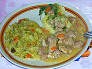 Pierś pietruszkowo-maślana , kapustka smażono-duszona z cebulką, lubczykiem, koperkiem, marchewką i pomidorkiem. Część kapustki ze śmietaną, jednak , wg mnie, lepsza wersja bez śmietanki.
