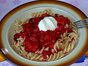 lub makaron z serem i truskawkami.