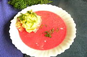 Gazpacho,wieprzowina z pieczarkami I mlode ziemniaczki do tego mloda kapusta.na deser:biszkopt z budyniem I truskawkami.