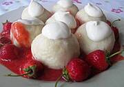 Deser, galaretka z truskawkami, bitą śmietaną i musem truskawkowym.