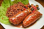 Roladki ze schabu z wędzonym boczkiem i kiszonym ogórkiem z sosem pieczeniowym, kasza gryczana, sałatka z kiszonych ogórków, czarnych oliwek, pomidorów malinowych, cebuli z ostrą papryką w proszku w winegrecie z zalewy od oliwek, soku z cytryny i pikantnej oliwy z oliwek.