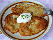Złociste placki ziemniaczane z sosem pieczarkowym