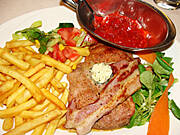 Czarnina z podrobami i kluseczkami, karkówka z grilla z boczkiem i masłem ziołowym, sałatka z pomidora, frytki, sos barbecue. Do popicia sok z czarnych porzeczek (dla mnie piwo)